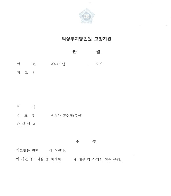 피고인의 변호인 홍현표 변호사는 피고인이 편취의 고의가 없었다는 이유로 무죄를 적극 주장·입증하였습니다.